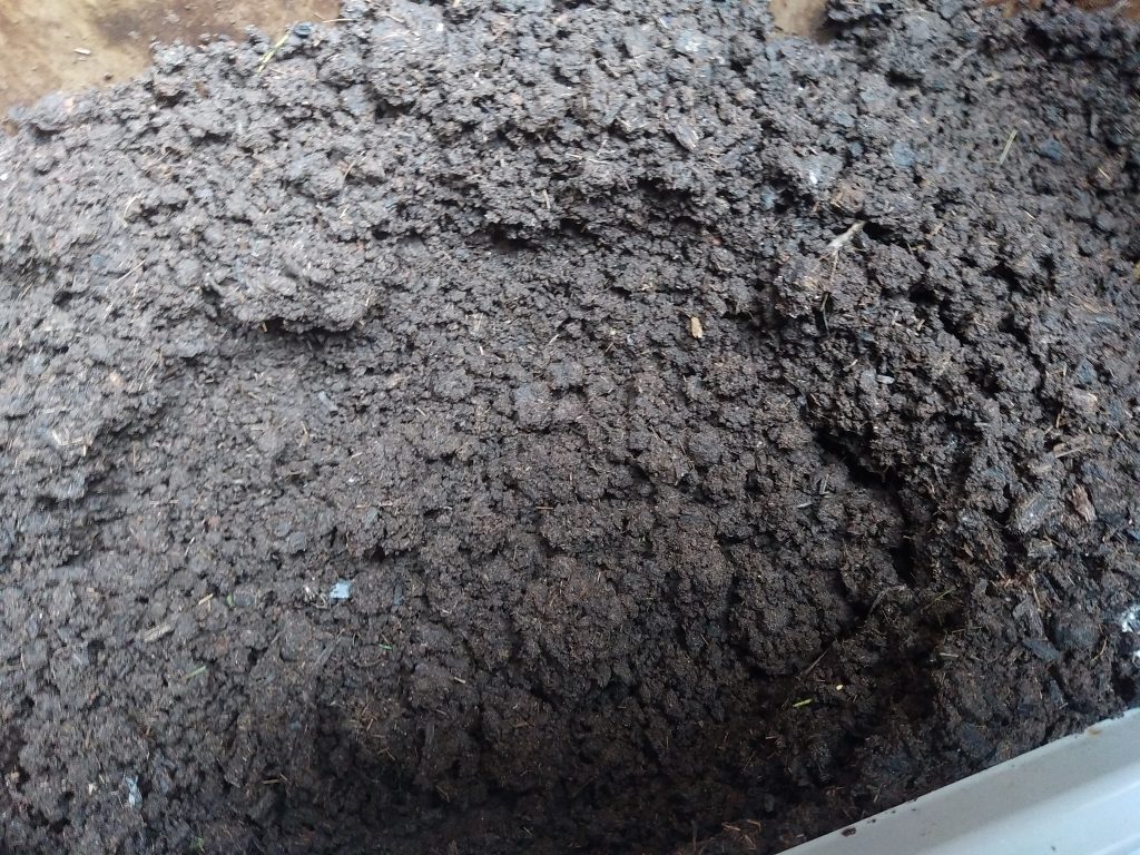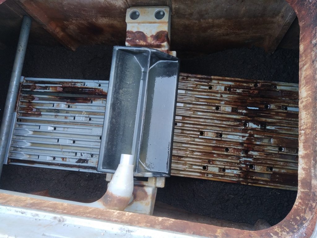 L'exemple ci dessous présente un filtre compact Coco 5 EH, dans un état normal, après 5 ans d'utilisation par 2 personnes, fonctionnant à 'plein gaz', après débouchage d'un bouchon dans le coude plongeant en entrée de fosse toutes eaux. Malgré le fort débit anomal, temporaire et directement lié à l'intervention d'entretien, l'auget fonctionne parfaitement et assure une bonne répartition des effluents en surface de filtre coco. De plus, le média coco est en bon état, non dégradé, et à un niveau normal.