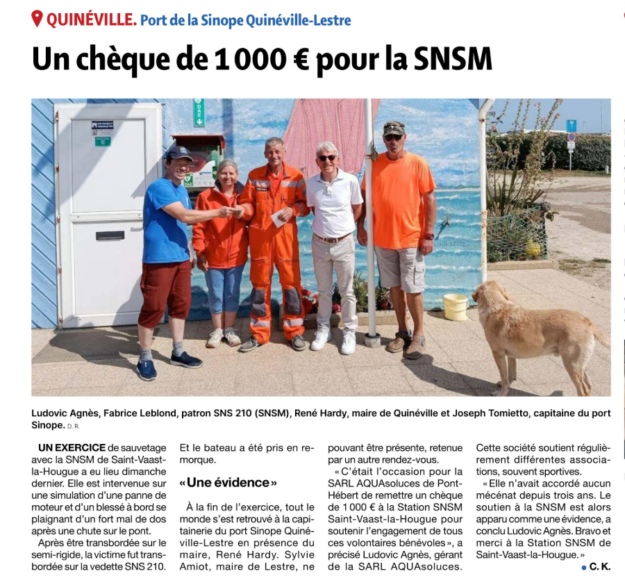 L'occasion pour AQUAsoluces de remettre un chèque à la station SNSM de Saint-Vaast-la-Hougue.