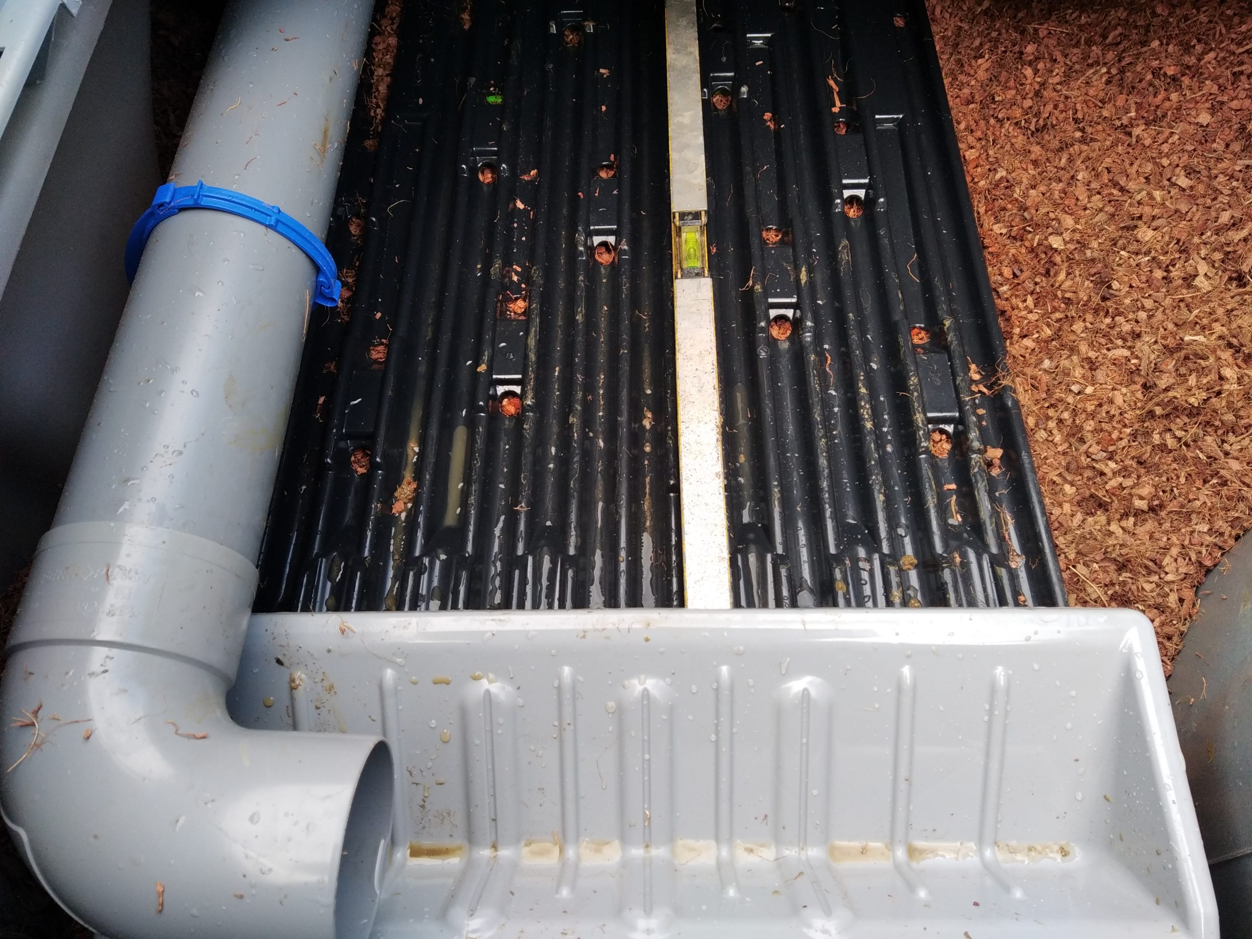 Ces eaux pré-traitées sont ensuite dirigées gravitairement vers le filtre compact associé, composé d'une cuve de 3000 Litres remplie de fibre de noix de coco.