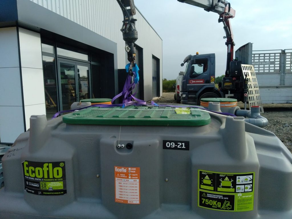 La parcelle est relativement spacieuse mais en quasi totalité empierrée. La filière retenue est alors un filtre compact ECOFLO PE2 5 EH Sortie Haute, fabriqué par Premier Tech Aqua.