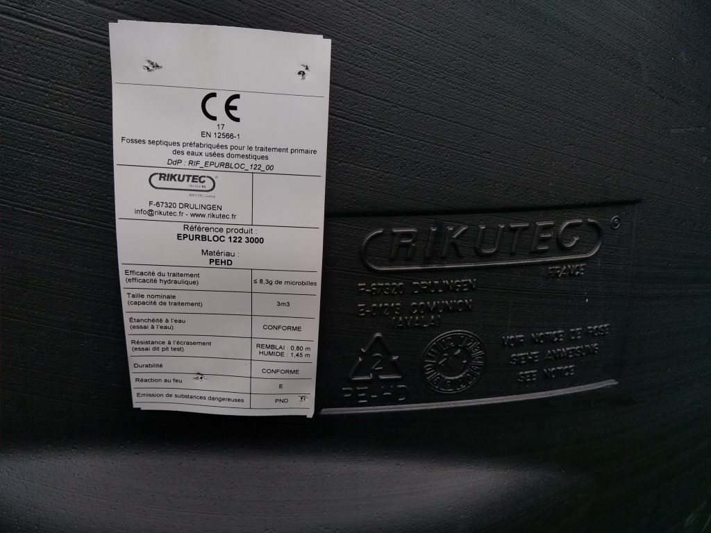 Les eaux usées brutes domestiques sont collectées gravitairement et pré-traitées dans une fosse toutes eaux de 3000 Litres, avec préfiltre intégré (Modèle Sotralentz Rikutec Epurbloc).