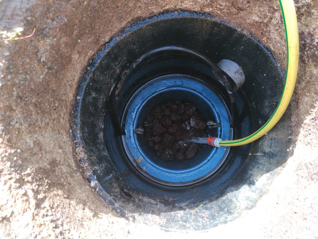 Le diagnostic est rapide : seule la canalisation en amont de la fosse est bouchée. La partie en aval de la fosse présente un bon écoulement.