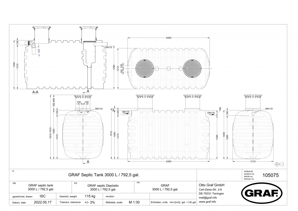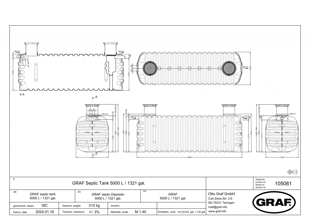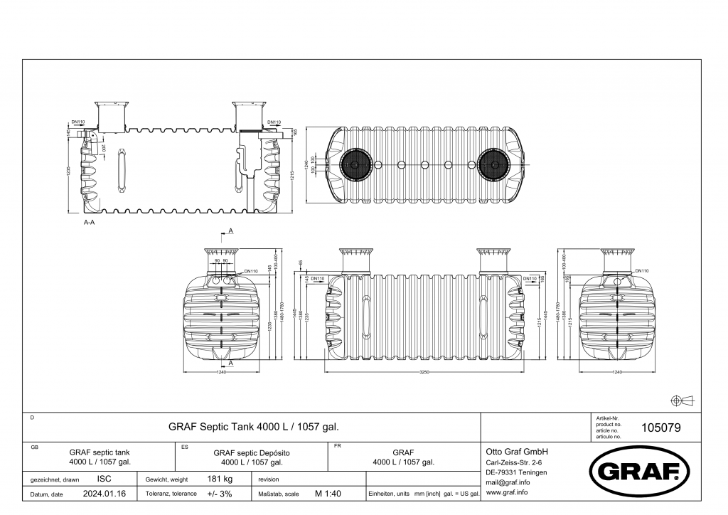 Ainsi, nous retenons et nous conseillons la fosse toutes eaux Graf avec pré-filtre Anaerobix. Cette cuve renforcée est fabriquée en polyéthylène haute densité et déclinée en 3 versions : 3 m3, 4 m3 et 5 m3 .