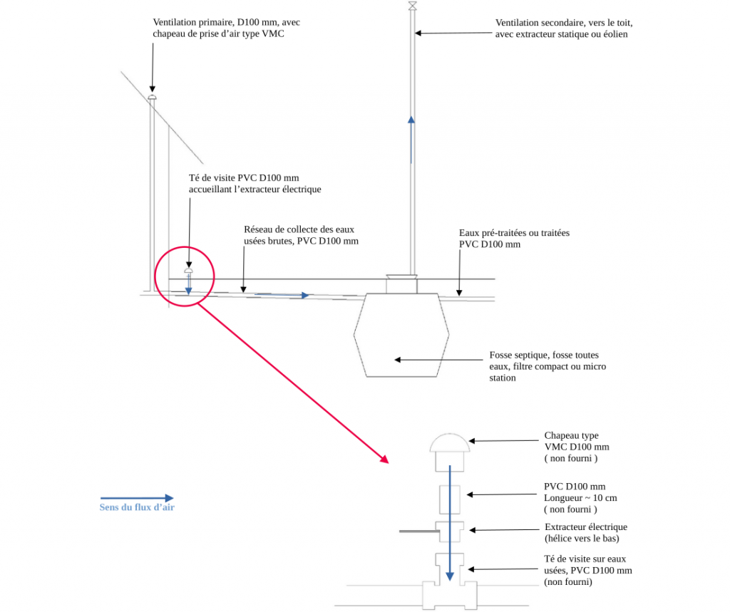 Pour rappel, le circuit de ventilation naturelle d'une fosse toutes eaux est composé d'une entrée d'air ( ventilation primaire ) et d'une sortie d'air ( ventilation secondaire ).
