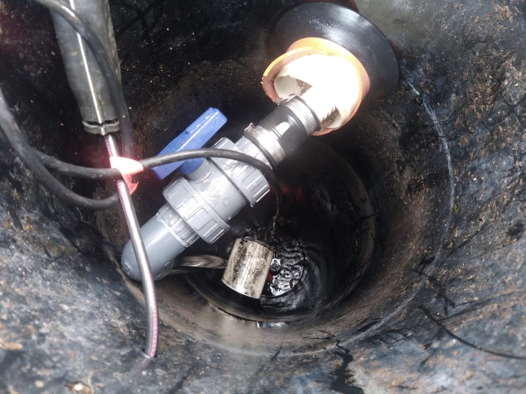 Nous procédons alors au dépannage de ce poste de relevage, avec réfection de la colonne de pompage en PVC pression D40 mm, mise en place d'une vanne union 3 points et d'un clapet anti-retour et remplacement de la pompe par le modèle Pedrollo Top 1 GM. Le raccordement électrique est réalisé à l'aide de Scotchlock 3M IP68 placés dans un sous marin étanche IP68 ( CellPack ).