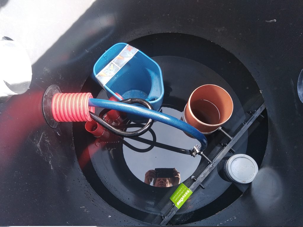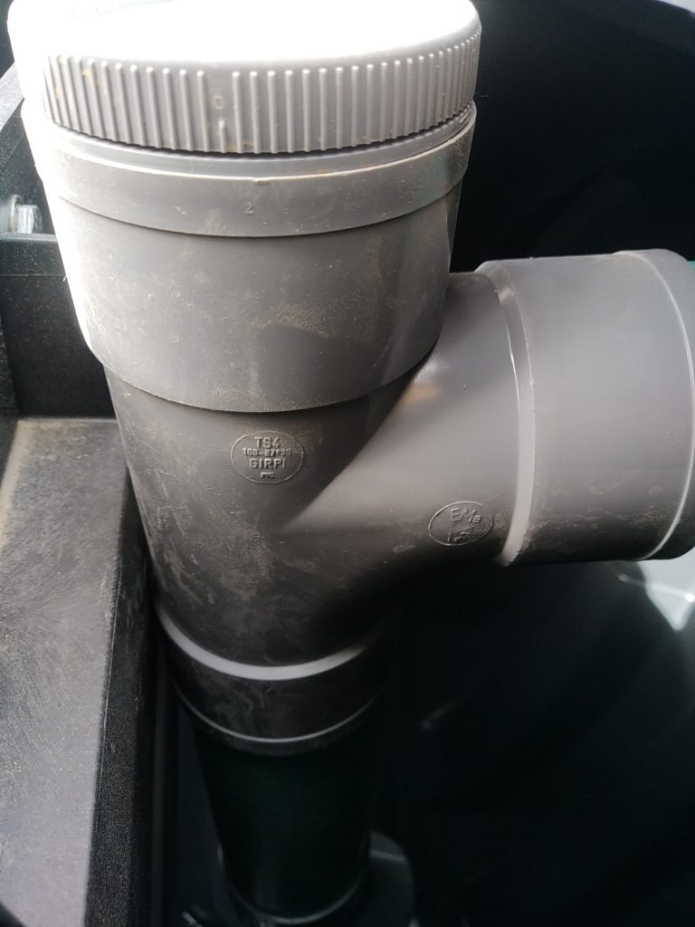 - Résoudre le problème en extérieur, directement dans la fosse toutes eaux ou la micro-station avec la mise en place d'un Té plongeant avec bouchon en surface.