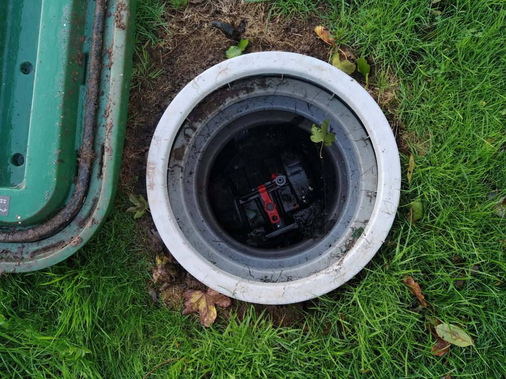 Enfin, nous lavons le préfiltre PF17, grâce au raccord automatique pour tuyau d'arrosage et nous effectuons une mesure de boue à l'aide d'un appareil précis optique et pressométrique (MUDLINE TG). On observe une accumulation de boue de 15%. Pour rappel, pour ce type de procédé épuratoire, une vidange s'impose à 50%. Il reste encore du temps !