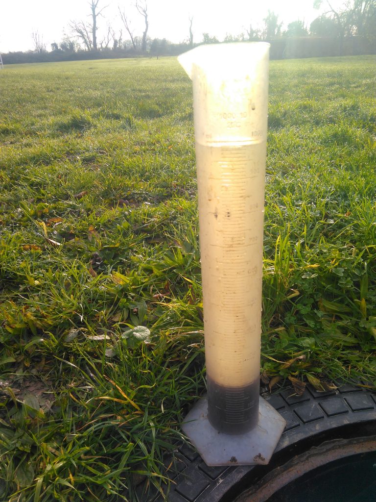 Une mesure du floch bactérien est effectuée dans le réacteur SBR. Un prélèvement est alors effectué juste après l'action de brassage / aération. Cet échantillon est décanté pendant 20 minutes. On observe ici un floch de 20% témoignant du bon équilibre de la station.