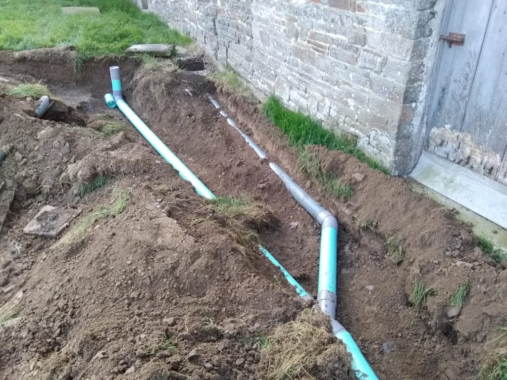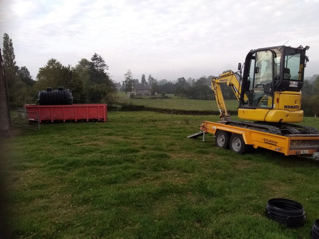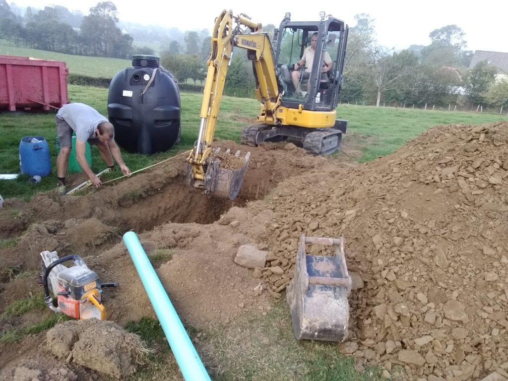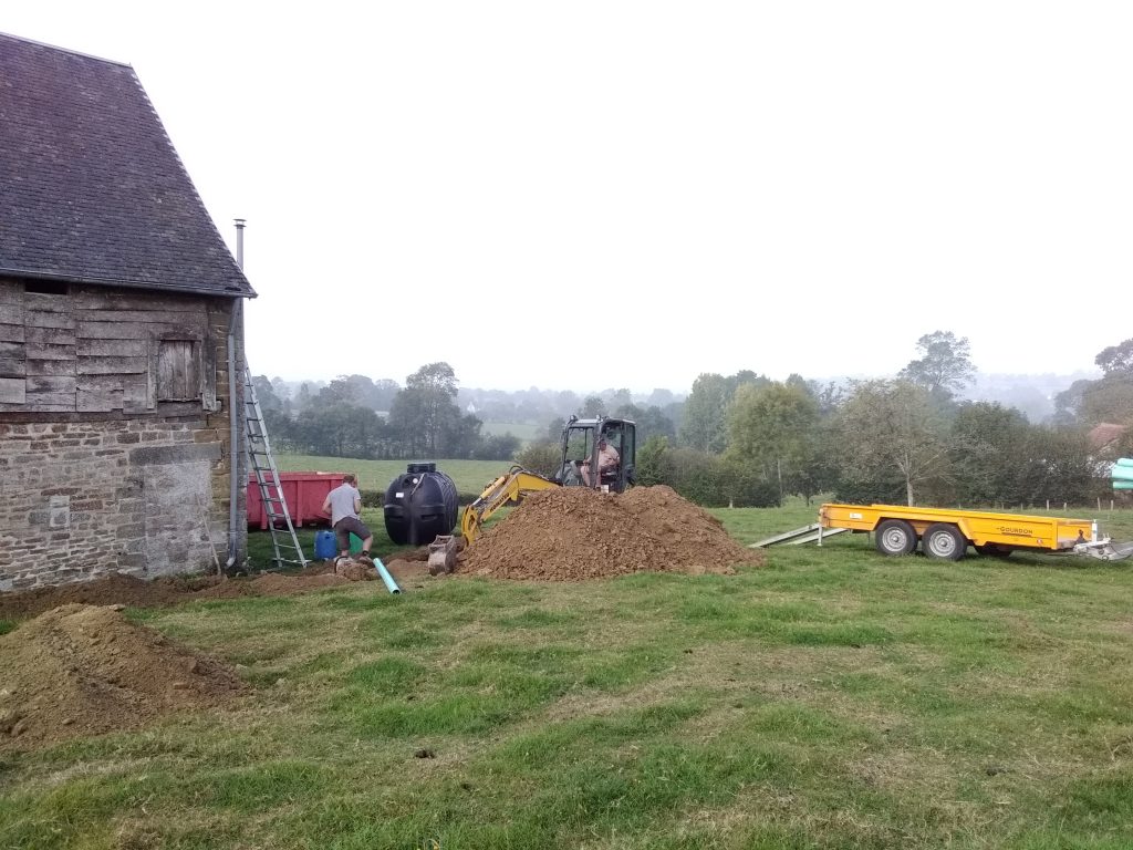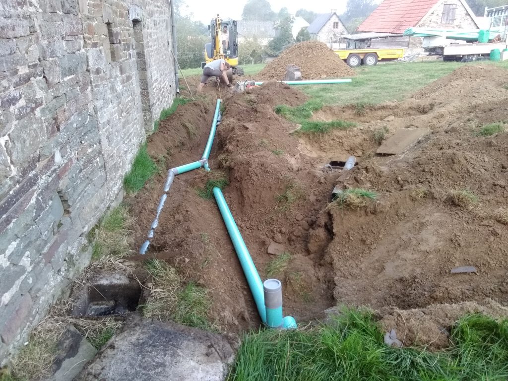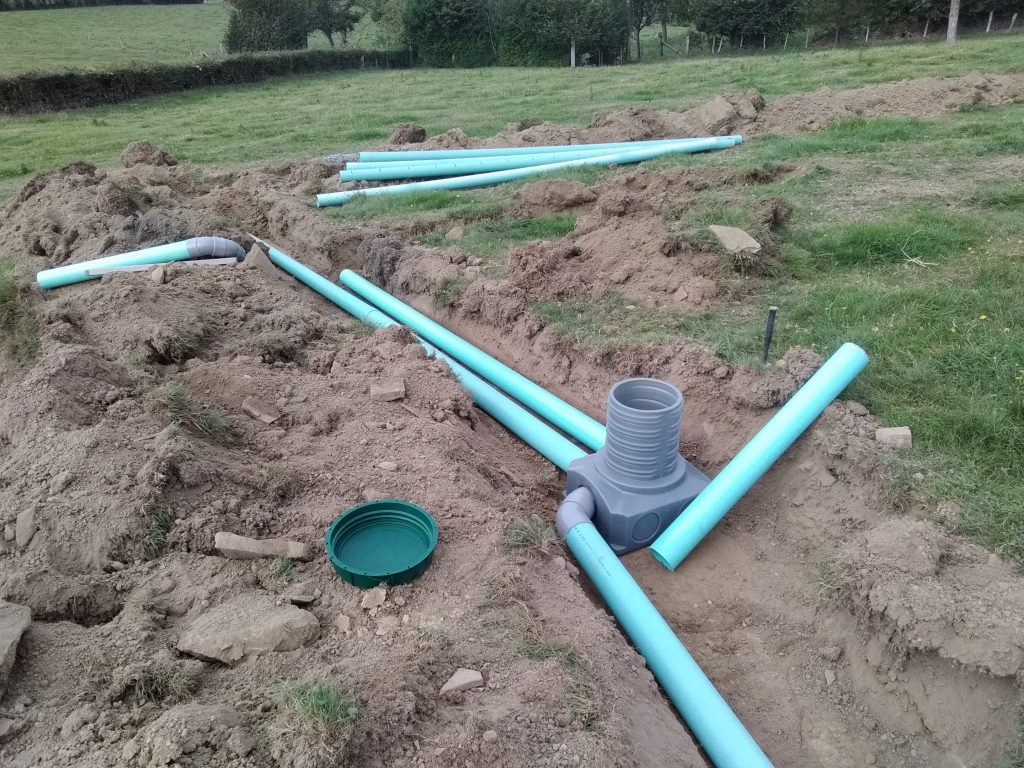 - Les eaux ainsi pré-traitées sont ensuite acheminées gravitairement vars l'épandage. Celui-ci assure un traitement efficace des eaux usées grâce aux bactéries aérobies présente naturellement dans le sol en place. Outre ce pouvoir épurateur du sol, celui-ci assure aussi une évacuation des eaux traitées par infiltration.
