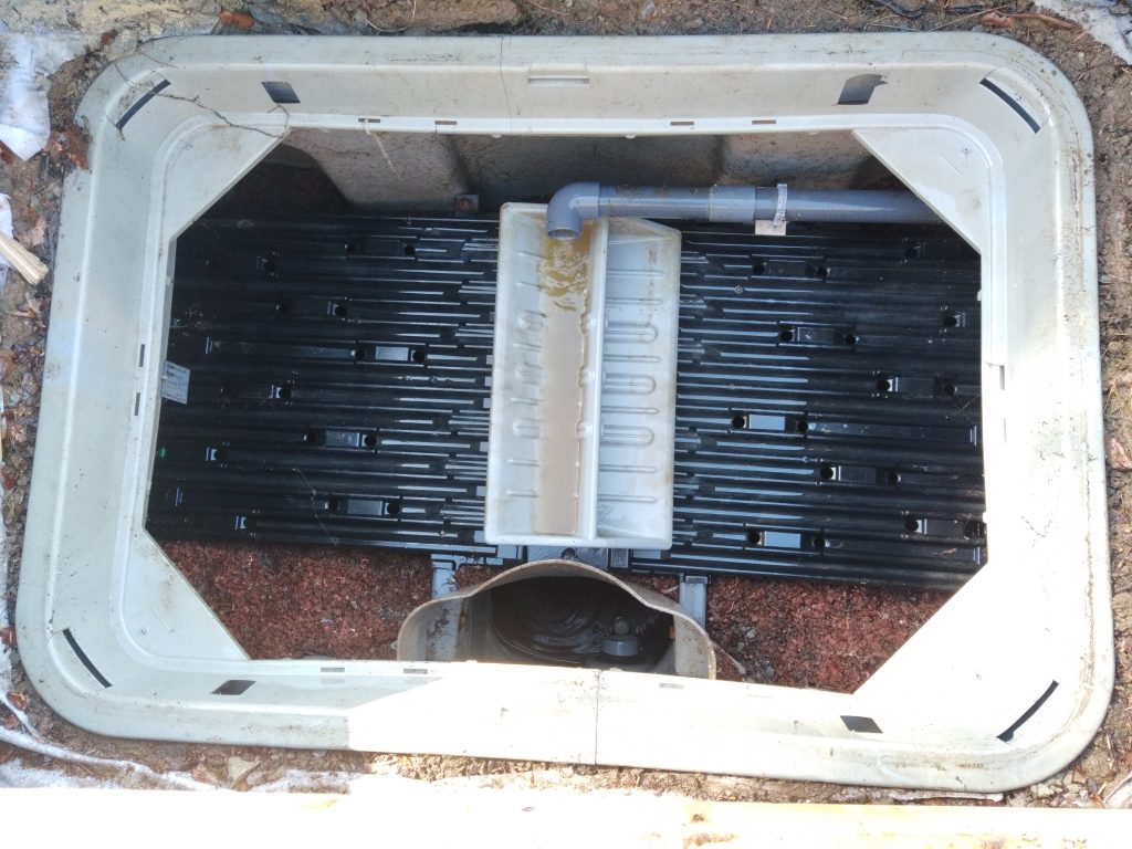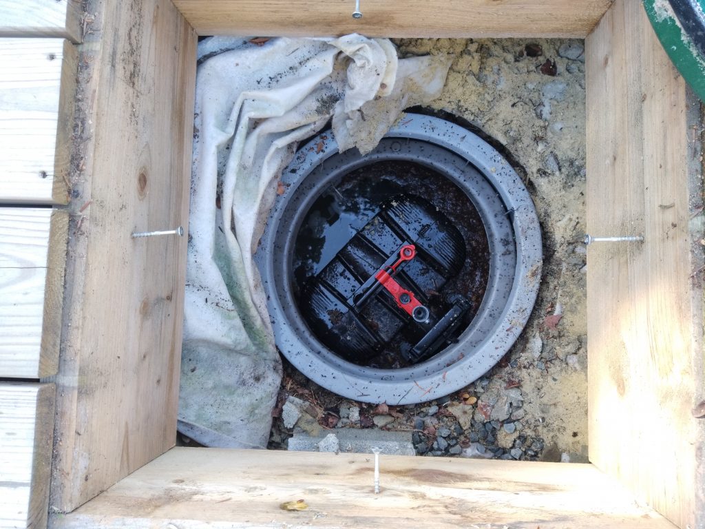 Nous intervenons aujourd'hui pour l'entretien d'un filtre compact ECOFLO PE2 pack 5 EH Sortie basse. Ce dispositif d'assainissement des eaux usées domestiques a été placé sous une terrasse. Cela reste réglementaire, sous ces conditions :