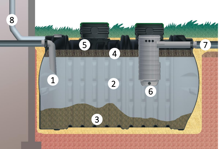 - Arrivée des eaux usées domestiques brutes ( eaux vannes + eaux grises, eaux pluviales exclues ) par un dispositif d’entrée permettant un accès pour le décolmatage et la décompression