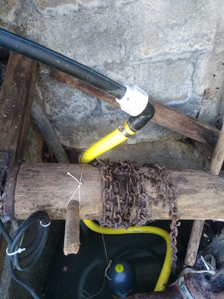 La pompe en place dans ce petit puits de surface était une pompe DAB Divertron, dont l'installateur avait fait preuve d'originalité pour le montage, avec une crépine directement vissée en pieds de pompe, puis posée au fond, dans les sédiments ...