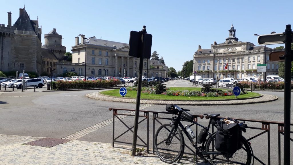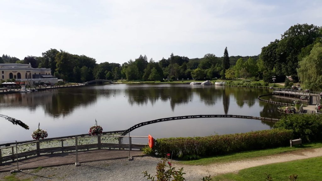 Lui aussi fait la Veloscenie mais io habite un peu avant Rambouillet et lui compte boucler sa partie en trois jours. Naturellement, on se met à rouler ensemble. Il a un train légèrement plus rapide que le mien. On opte pour la version non super sportive de ce segment de Veloscenie. On va vers Pré en Pail à 24 kms. Il fait très chaud sur cette portion et il y a quelques belles montées qui se calment avant Pré en Pail. On arrive au bout et ayant vraiment chaud. On prend un verre trreeeees rafraîchissant dans un bar et on repart vers Bagnoles de l'Orne où on arrive assez frais vers 17h30. Un rapide point. On a tous les deux envie de pousser plus loin. Il y a des campings labellisés Veloscenie à Domfront à 21 km alors on y va. On fait quelques photos de Bagnoles de l'Orne et de son plan d'eau magnifique. C'est alors que je découvre que mon pneu arrière se dégonfle. Je regonfle. Ca semble tenir. On entame une longue ligne droite en succession de côtes et descentes. On bifurque vers un chemin forestier où je regonfle parce que ça continue de se dégonfler…
