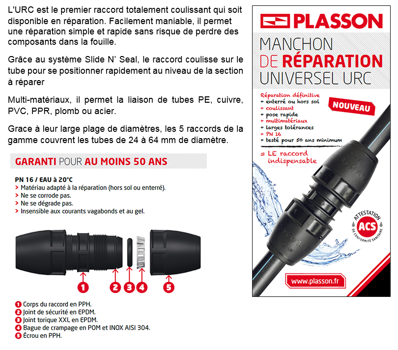 Parfois, pour réparer, il faudra réaliser une jonction multi-matériaux, par exemple PE-PVC. Le manchon de réparation universel, conçu par Plasson, devient alors très utile, mais surtout redoutablement efficace !