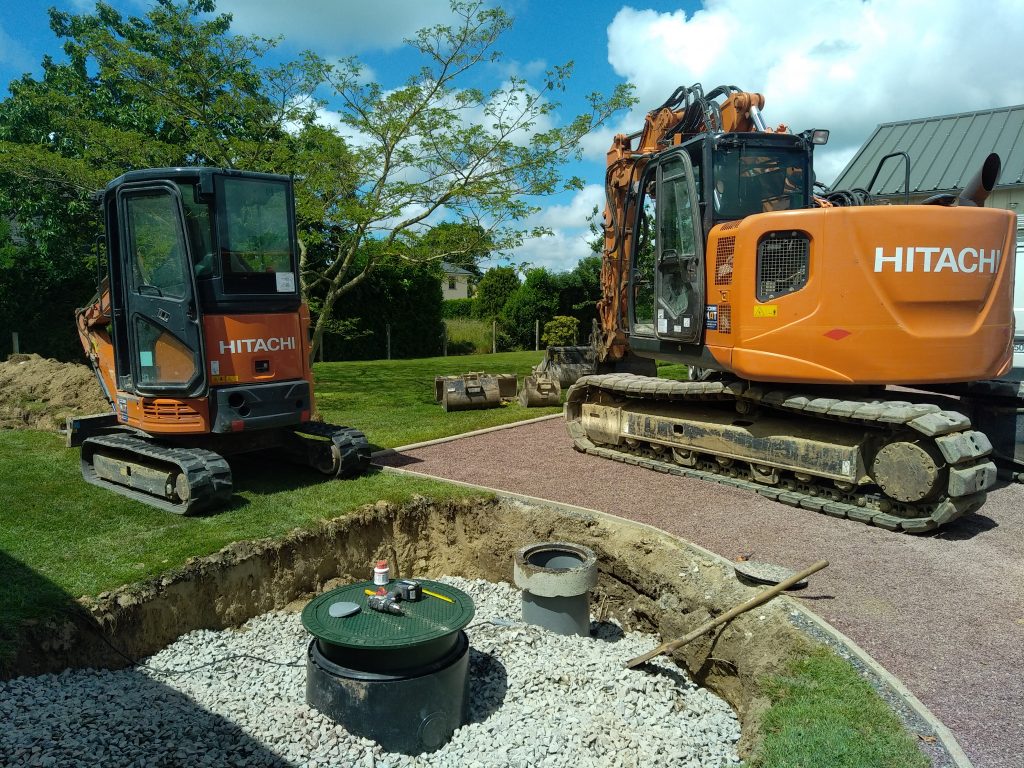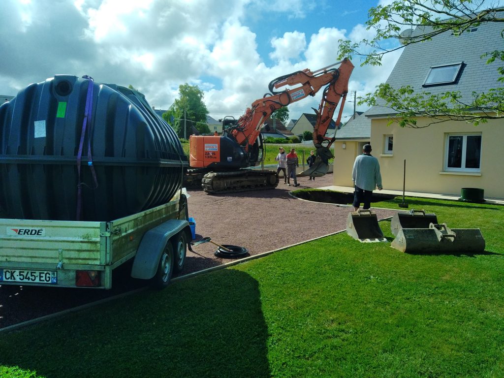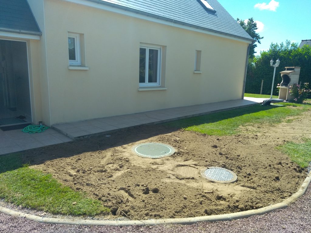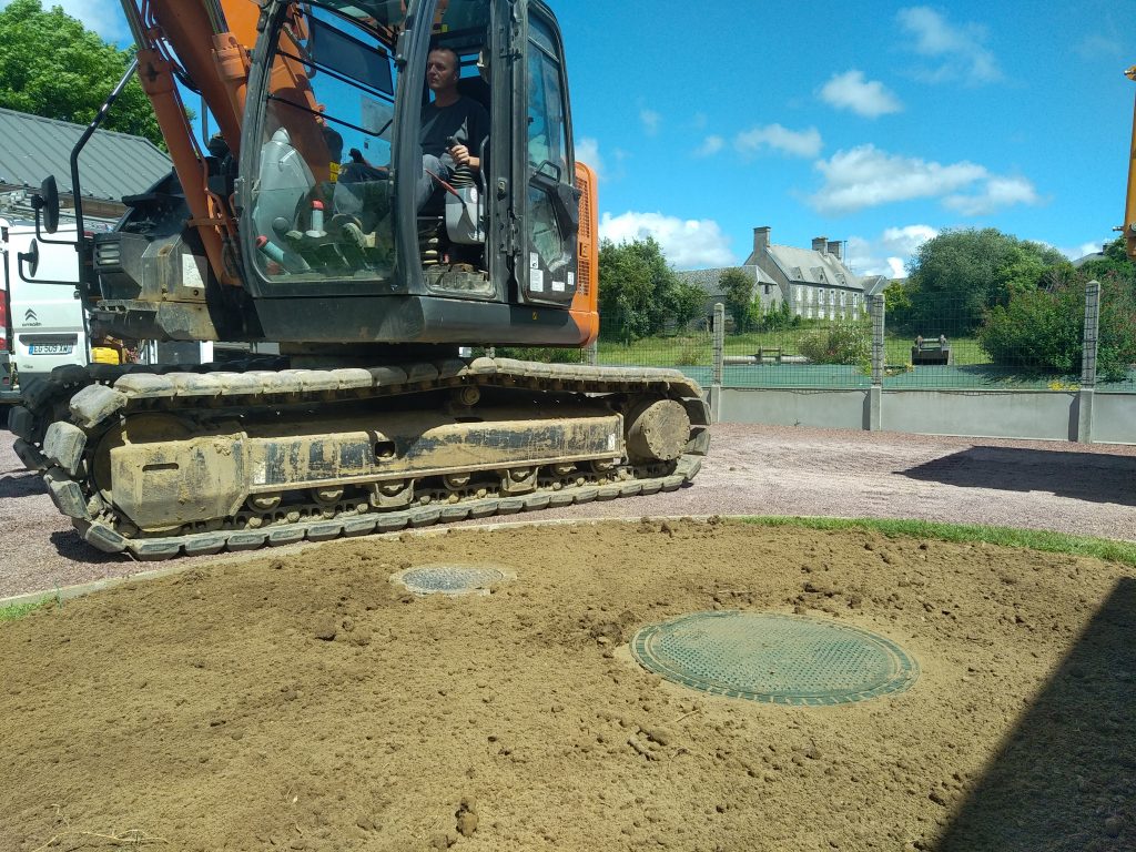 Pose d'une micro station d'épuration Graf EasyOne 5 EH, à Muneville-sur-Mer (50290), avec la SARL Gamblin TP de Saint-Jean-des-Champs (50320), selon l'étude de sol et de définition de filière d'Assainissement Non Collectif réalisée par la SARL AQUAsoluces.
