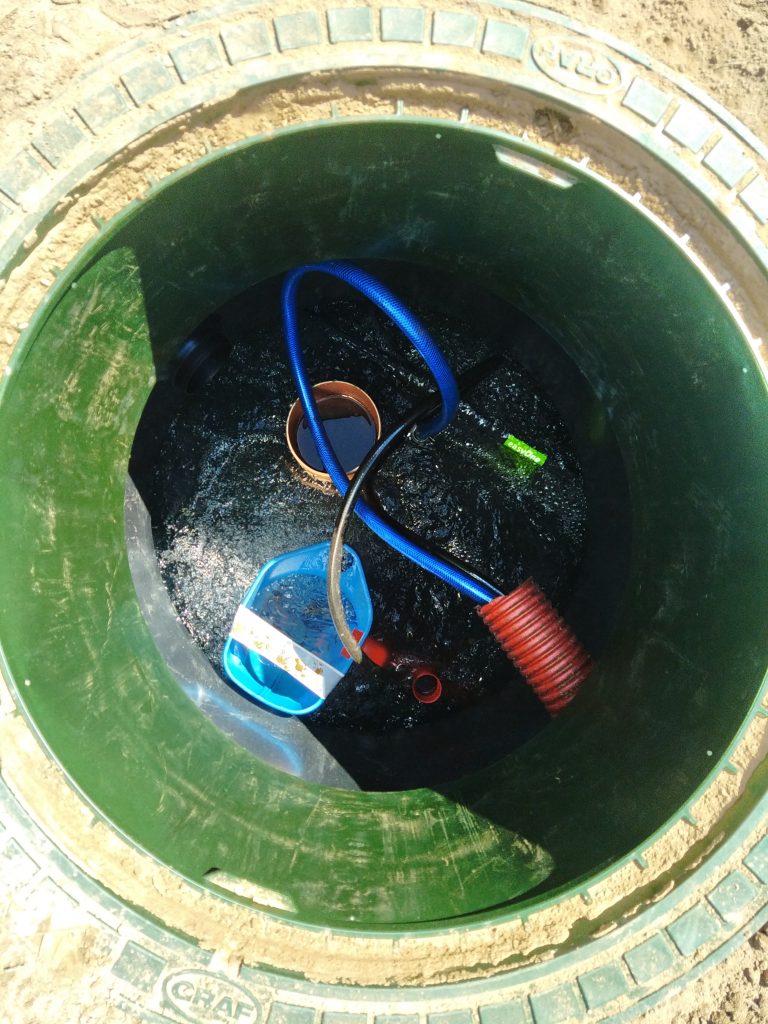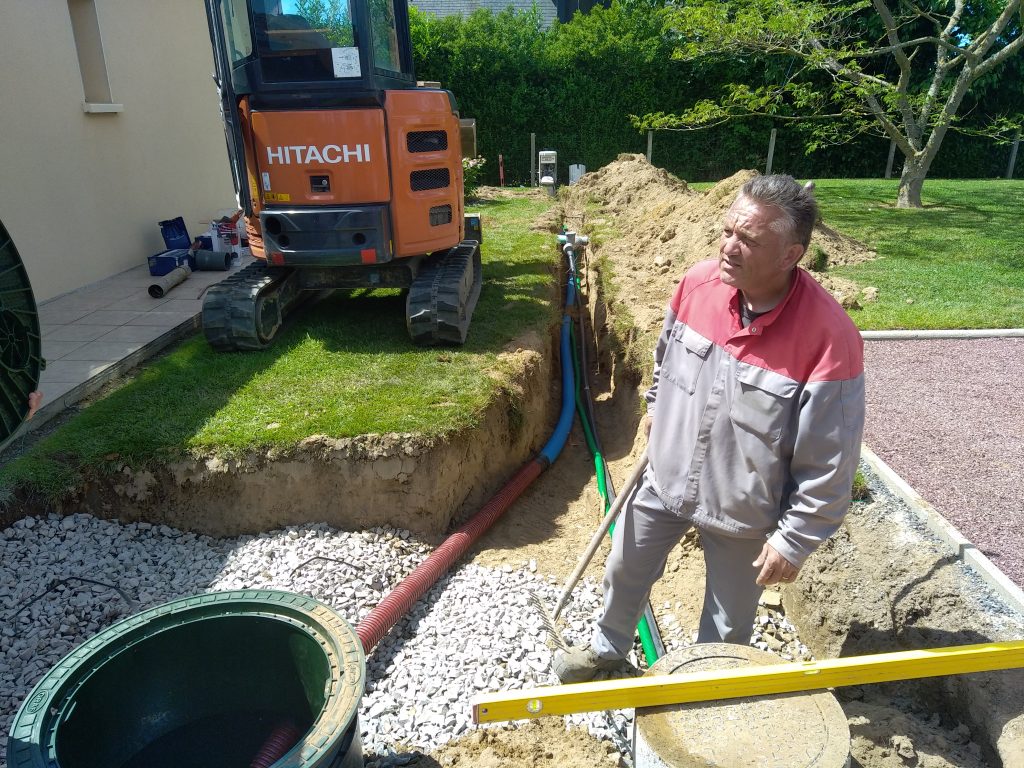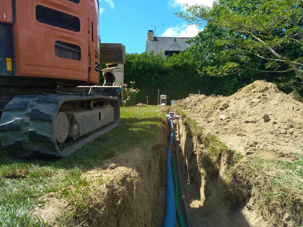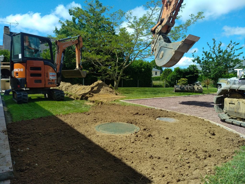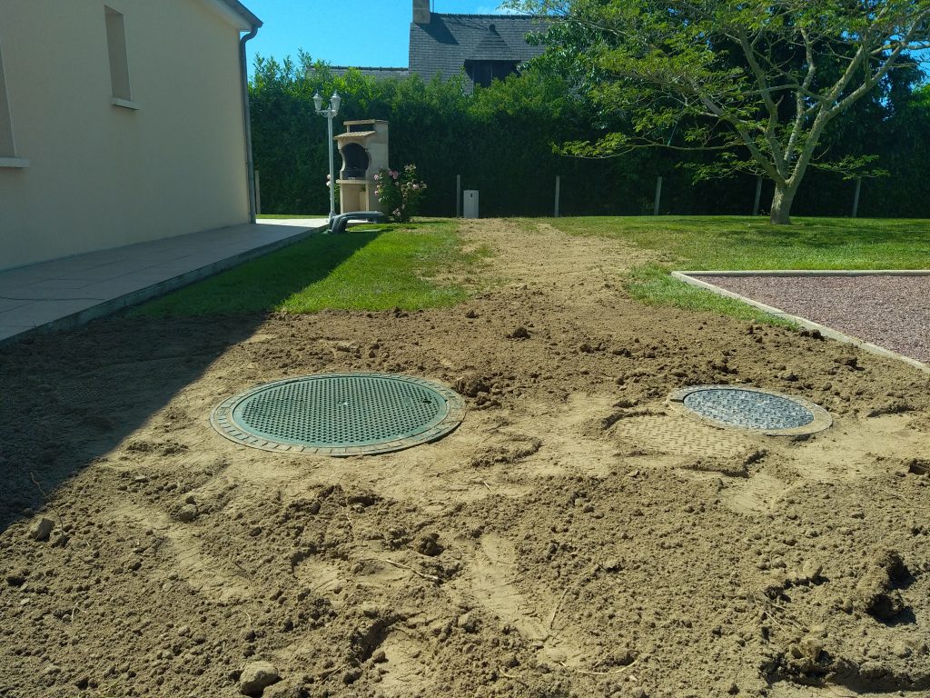 Pose d'une micro station d'épuration Graf EasyOne 5 EH, à Muneville-sur-Mer (50290), avec la SARL Gamblin TP de Saint-Jean-des-Champs (50320), selon l'étude de sol et de définition de filière d'Assainissement Non Collectif réalisée par la SARL AQUAsoluces.