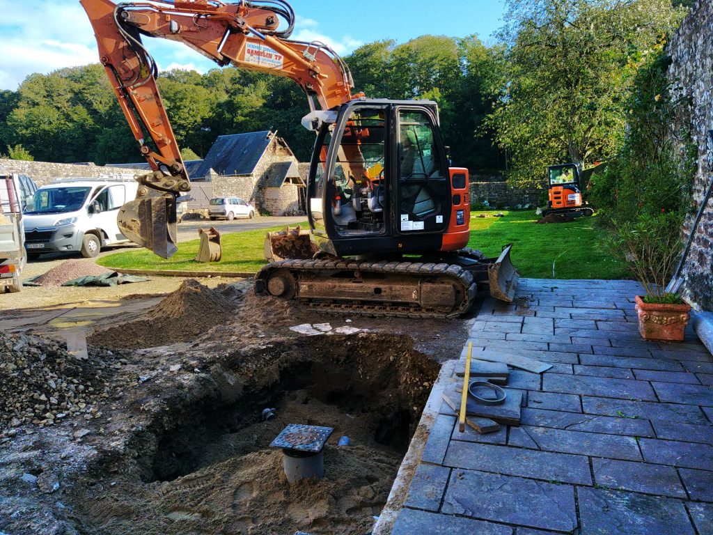 En ces lieux chargés d'histoire, nos prières semblent avoir été entendues ... La cuve CARAT de 6500 Litres de la Micro station Graf EasyOne 9 EH est posée sans difficulté.