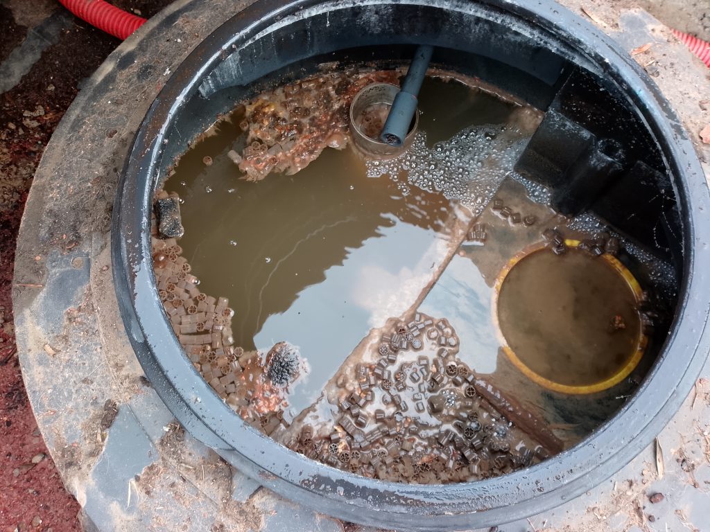 C'est la catastrophe ! Le décanteur primaire et le réacteur sont en charge, avec débordement et migration des biobilles. L'usager nous a contacté, inquiet, après l'observation de biobilles dans le fossé ou se déversent les eaux usées domestique traitées par cette micro-station.