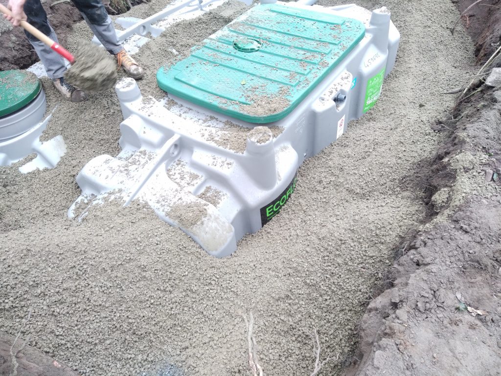 Nous intervenons aujourd'hui à Pirou ( 50770 ) pour la pose d'un filtre compact ECOFLO PE2 pack 6 EH sortie haute, avec pompe de relevage / refoulement intégrée.
