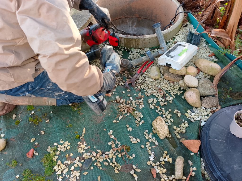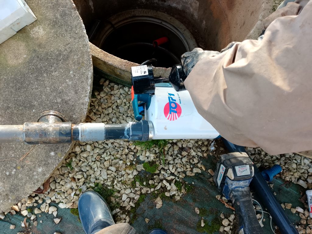 Nous préférons mettre en place un modèle de pompe plus sûr et éprouvé depuis de nombreuses années. Ainsi nous faisons confiance à Pedrollo et sa pompe TOP1 GM. Celle-ci est rapidement mise en place , nous en profitons pour refaire la colonne de pompage et nous procédons au réglage du marnage de son flotteur magnétique vertical. Le raccord électrique est refait à l'aide de Scotchlock 3M à gel hydrophobe logés dans le Cellpack IP68.