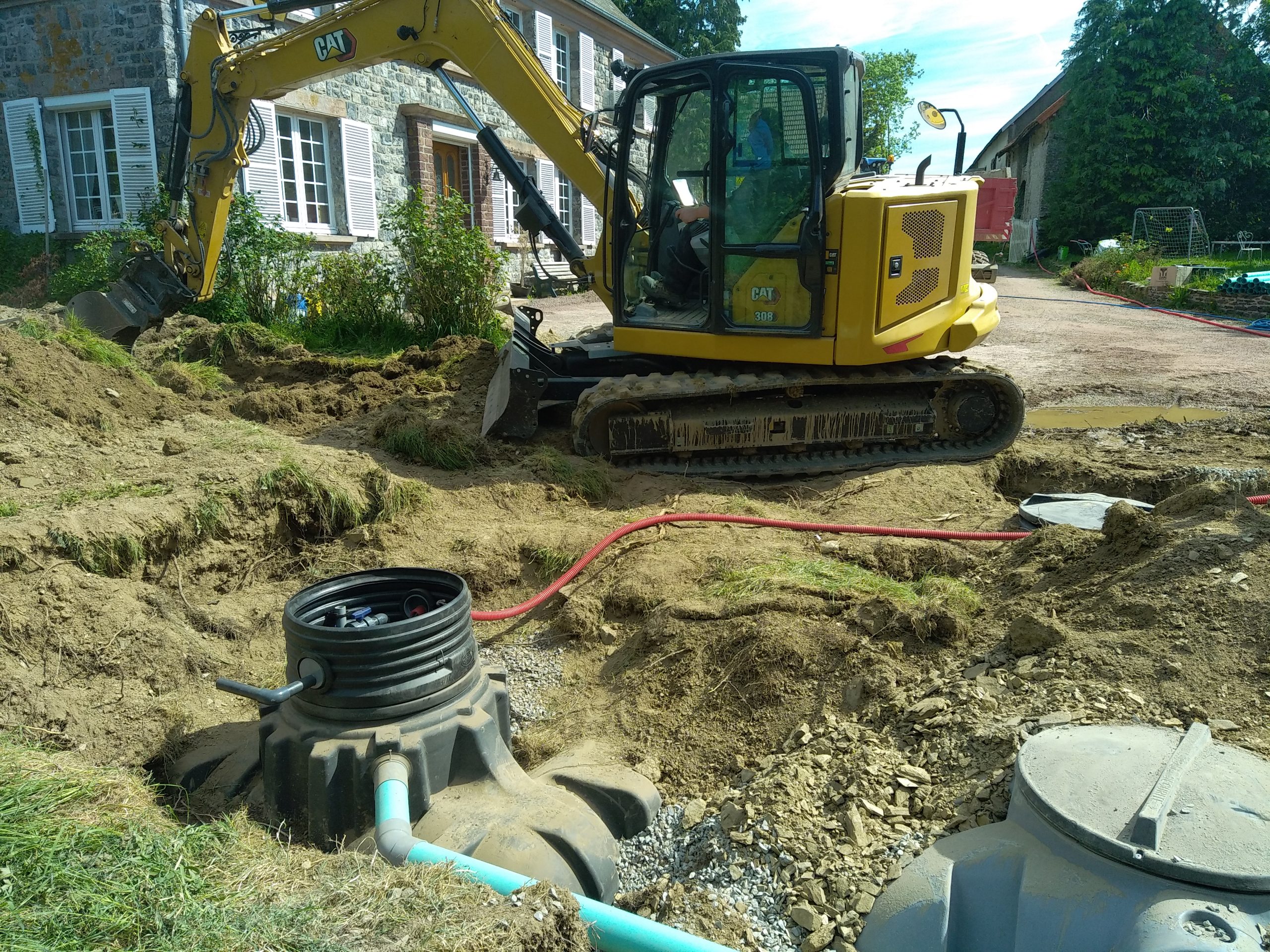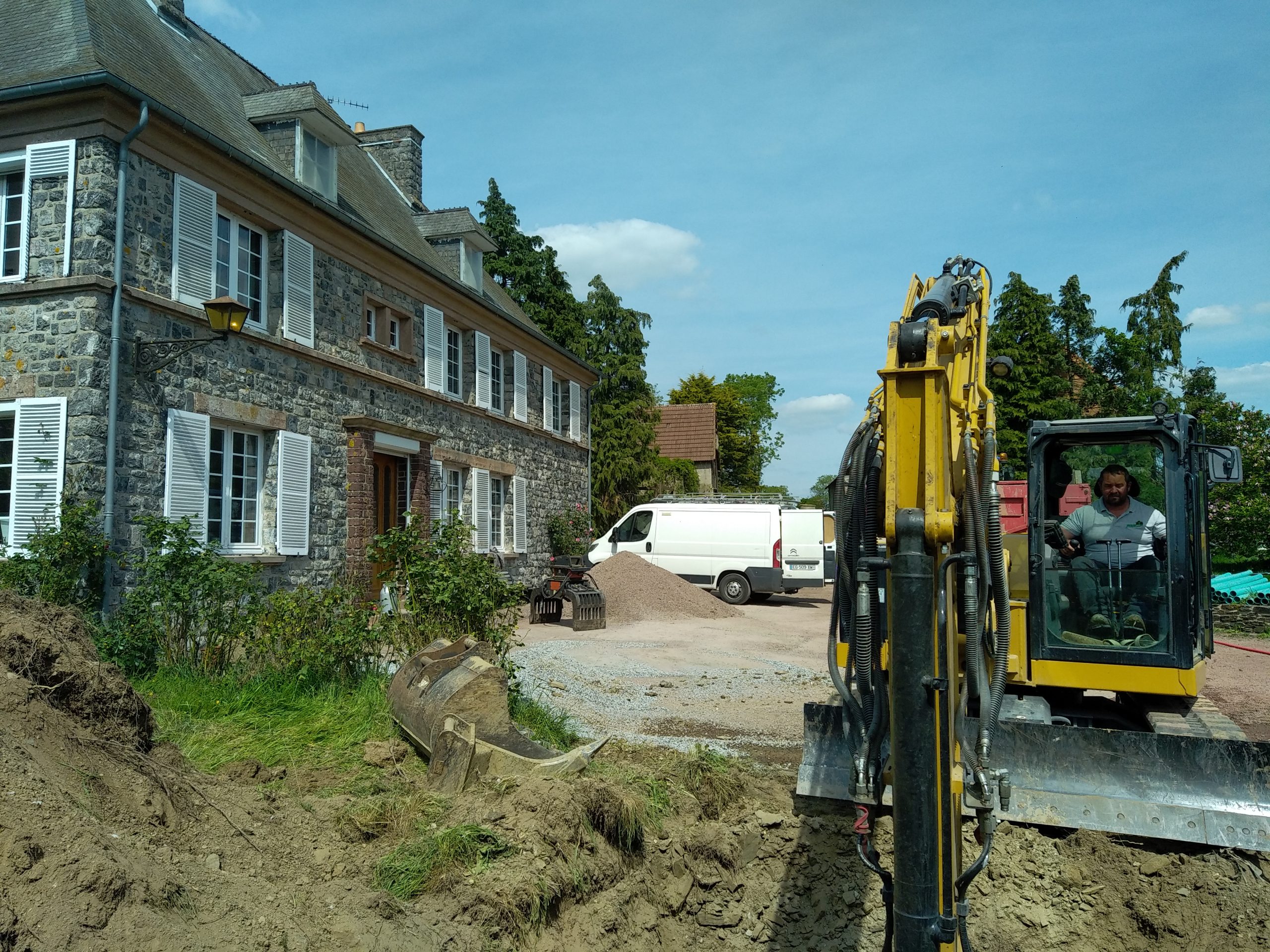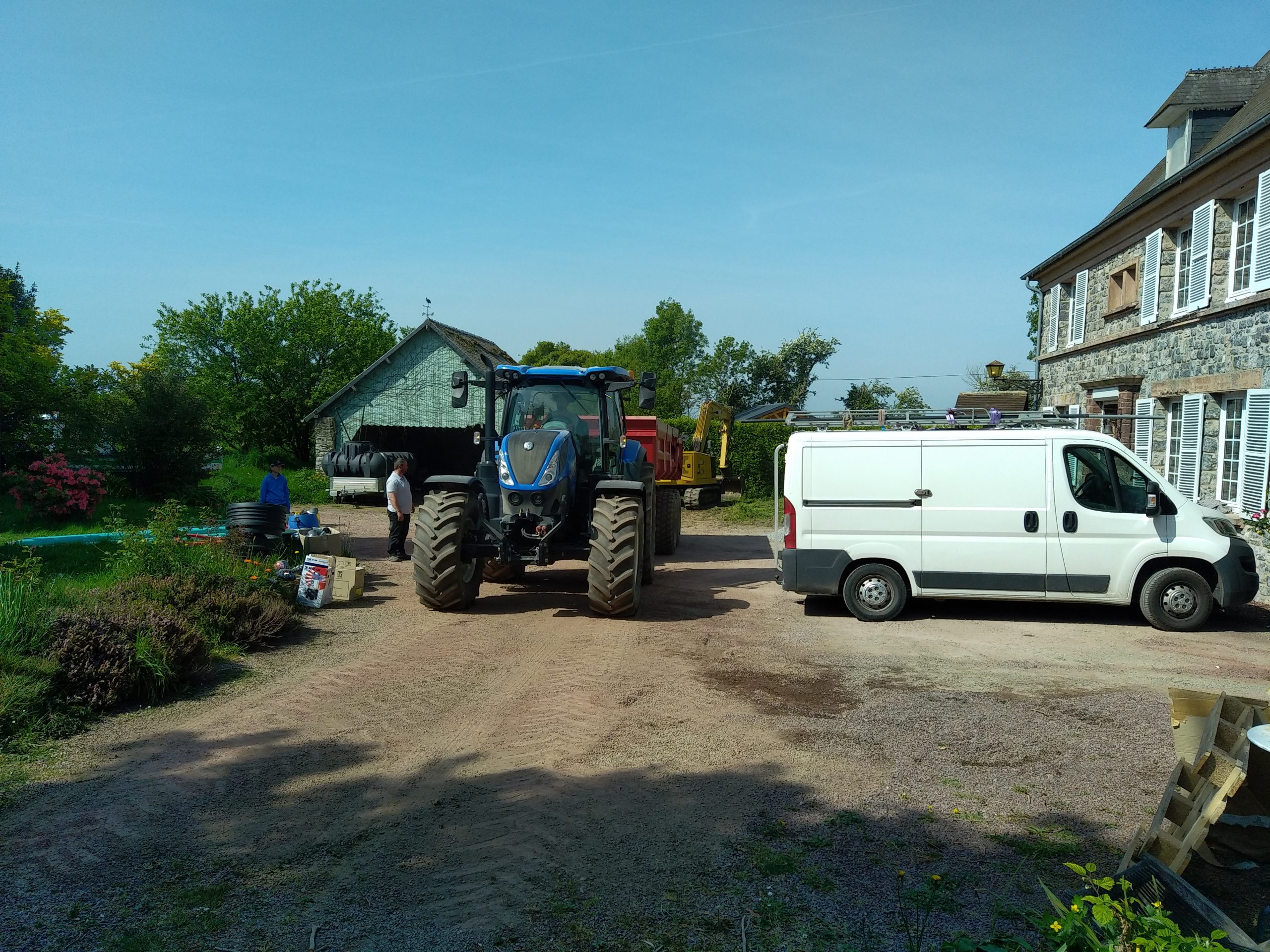 Le chantier de pose de l'ensemble, Fosse toutes eaux, poste de relevage et épandage, a été réalisé par la SARL Erick HAMOND de La Meauffe ( 50880 ). Le poste de relevage a été conçu, assemblé et mis en service par la SARL AQUAsoluces.