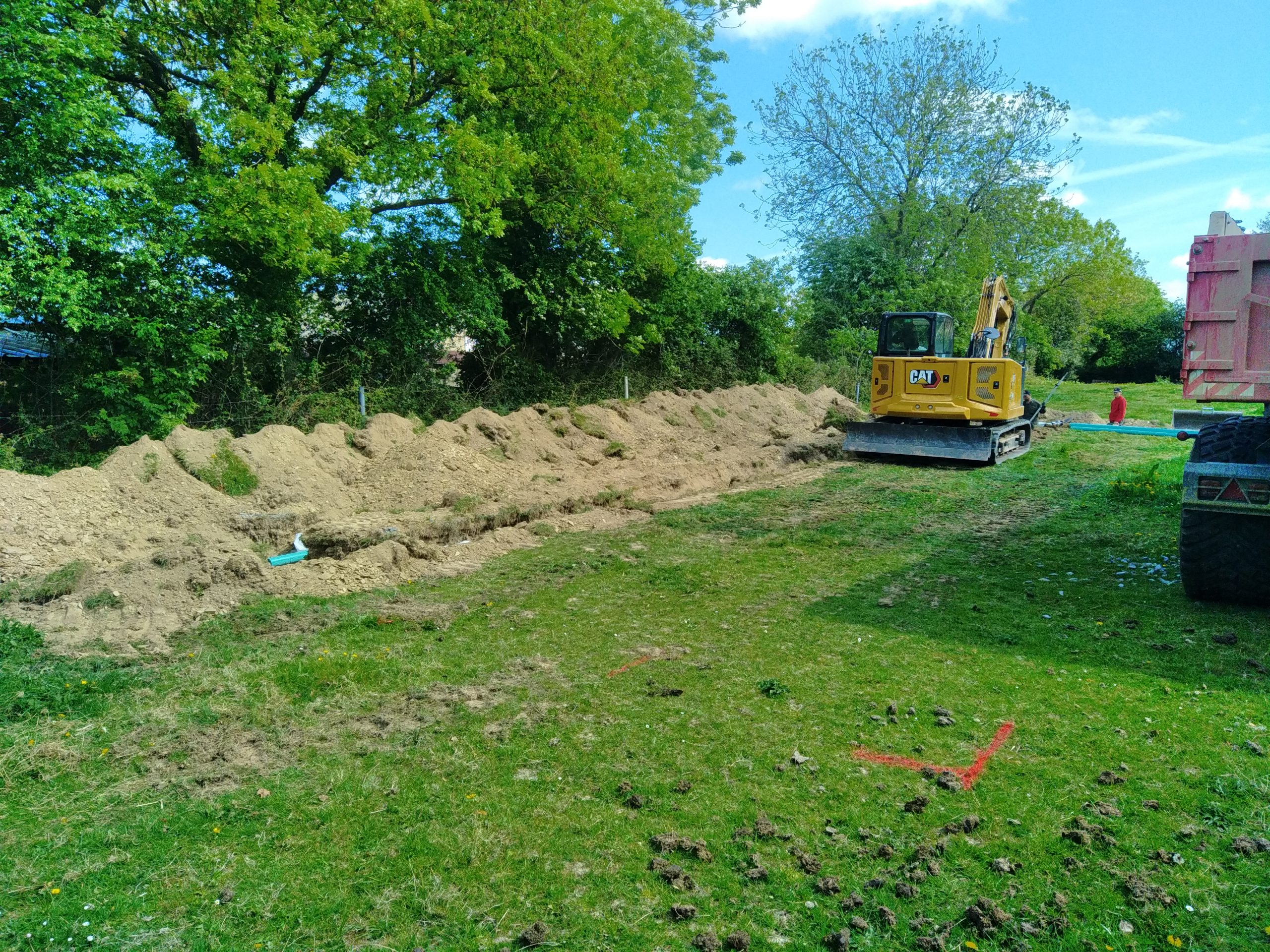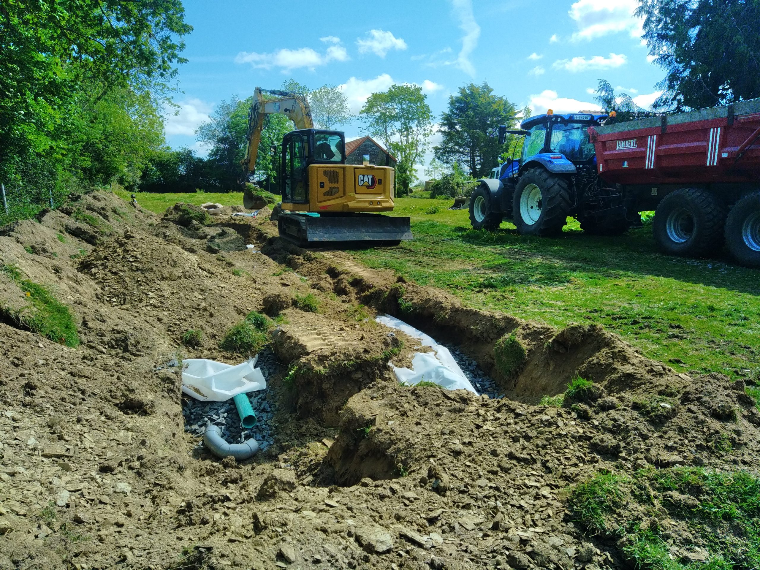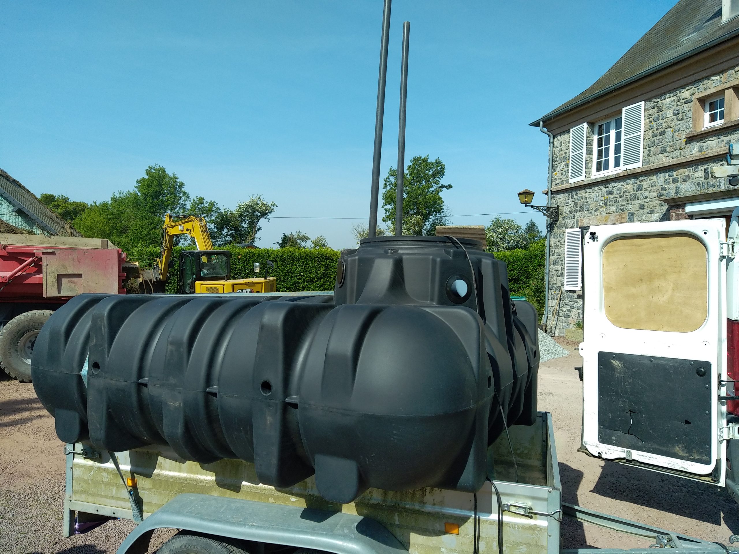 Le chantier de pose de l'ensemble, Fosse toutes eaux, poste de relevage et épandage, a été réalisé par la SARL Erick HAMOND de La Meauffe ( 50880 ). Le poste de relevage a été conçu, assemblé et mis en service par la SARL AQUAsoluces.