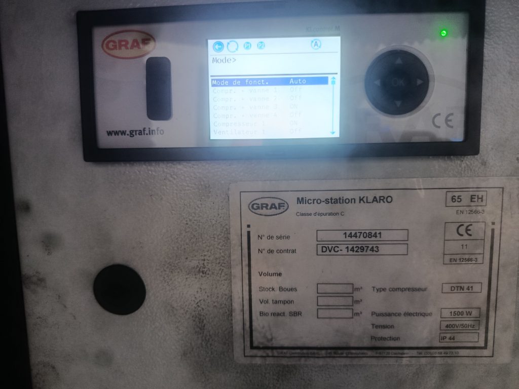 Nous intervenons pour le dépannage et la remise en service d'une station d'épuration Graf Klaro 65 EH, composée de 2 cuves Carat de 16 000 Litres chacune, et utilisée pour un restaurant.