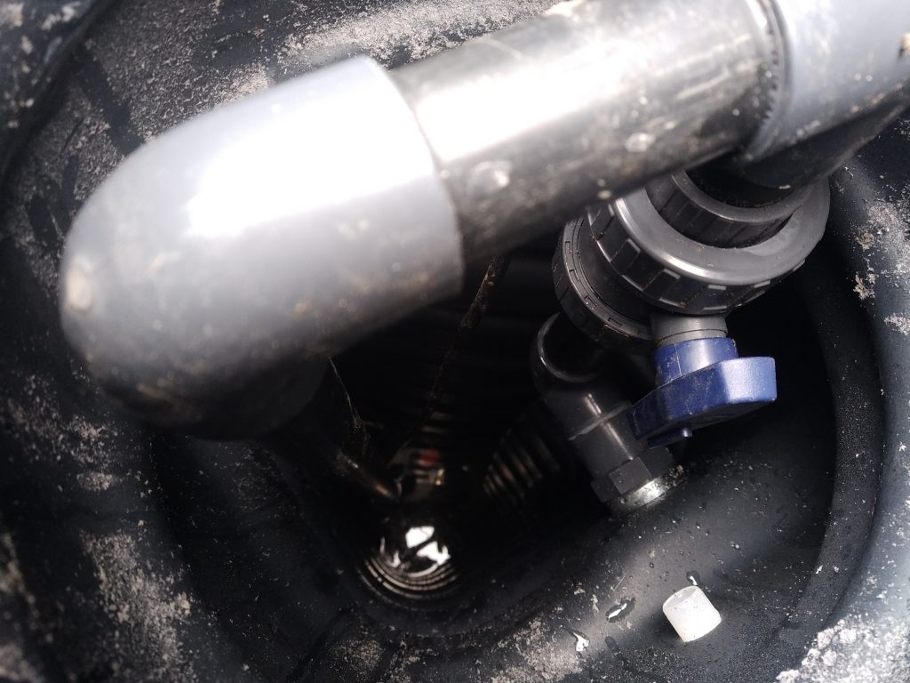 Malgré la faible place disponible, la vanne union 3 points permet une extraction aisée de la pompe, facilitant les opérations de maintenance. Placée à moins d'une longueur de bras de la surface, cette vanne reste facilement accessible, même si nous préférons d'habitude sa pose horizontale.
