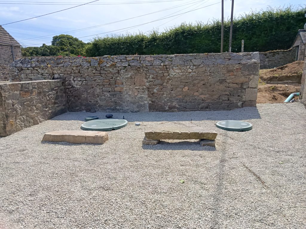 Lors de notre étude de sol et de définition de filière, réalisée en Avril 2025, nous avons retenu, pour cette résidence secondaire , composée de 5 pièces principales, la mise en place d'un filtre compact Graf easyCompact 5 EH, sortie haute, avec poste de relevage intégré. Faute de place suffisante pour une infiltration, les eaux ainsi traitées sont ensuite évacuées vers le réseau hydraulique superficiel.