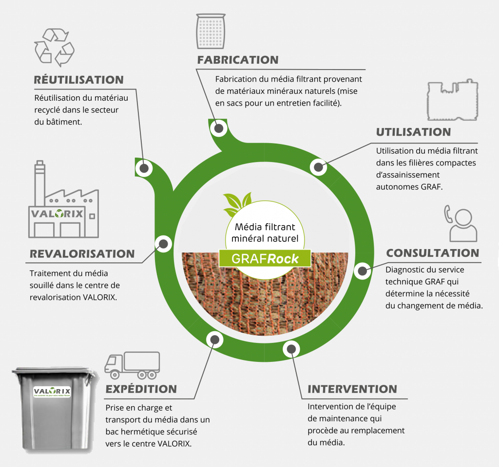 Le média filtrant GrafRock de ce filtre compact, composé de laine de roche, est garanti 10 ans. Il est à renouveler selon son état de dégradation et selon l'usage. Chaque installation est donc unique !