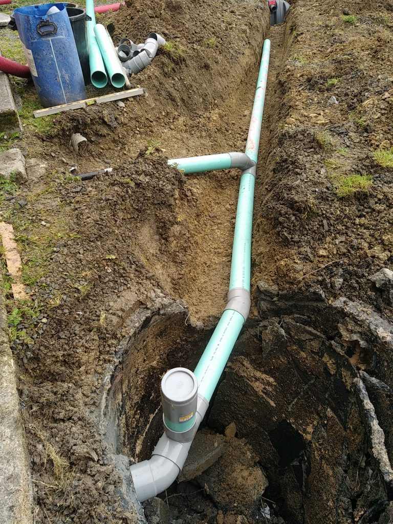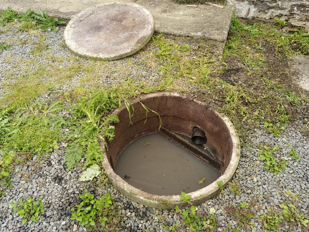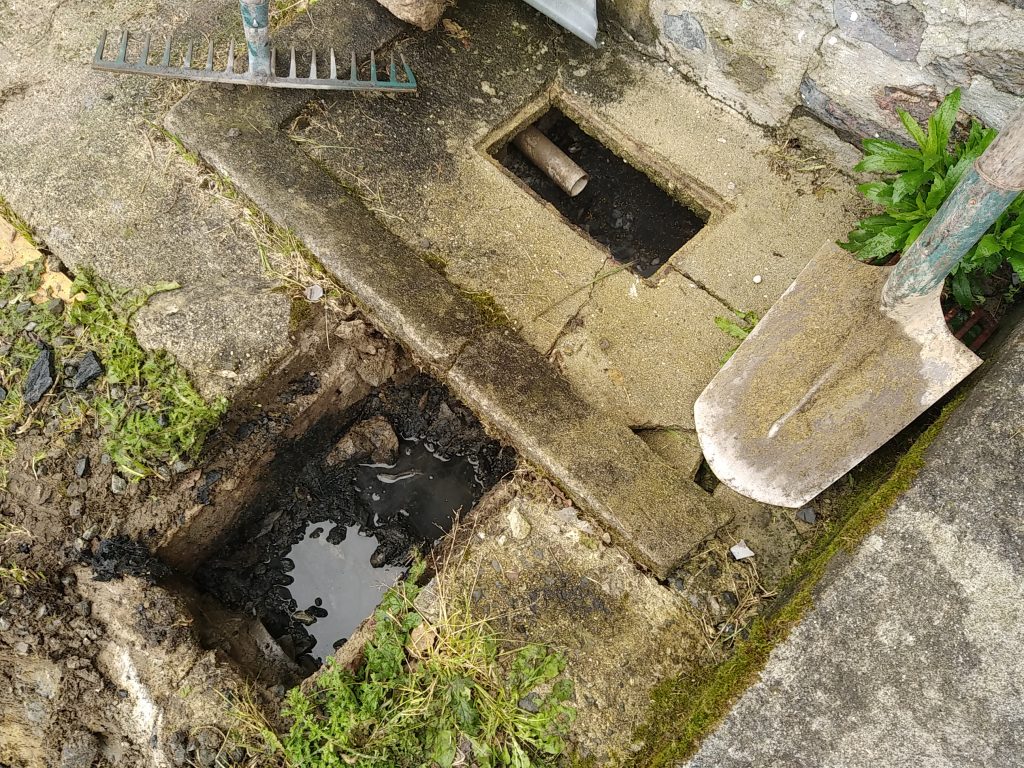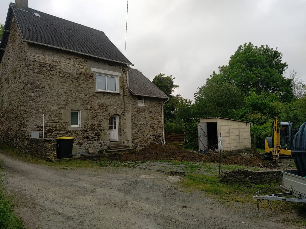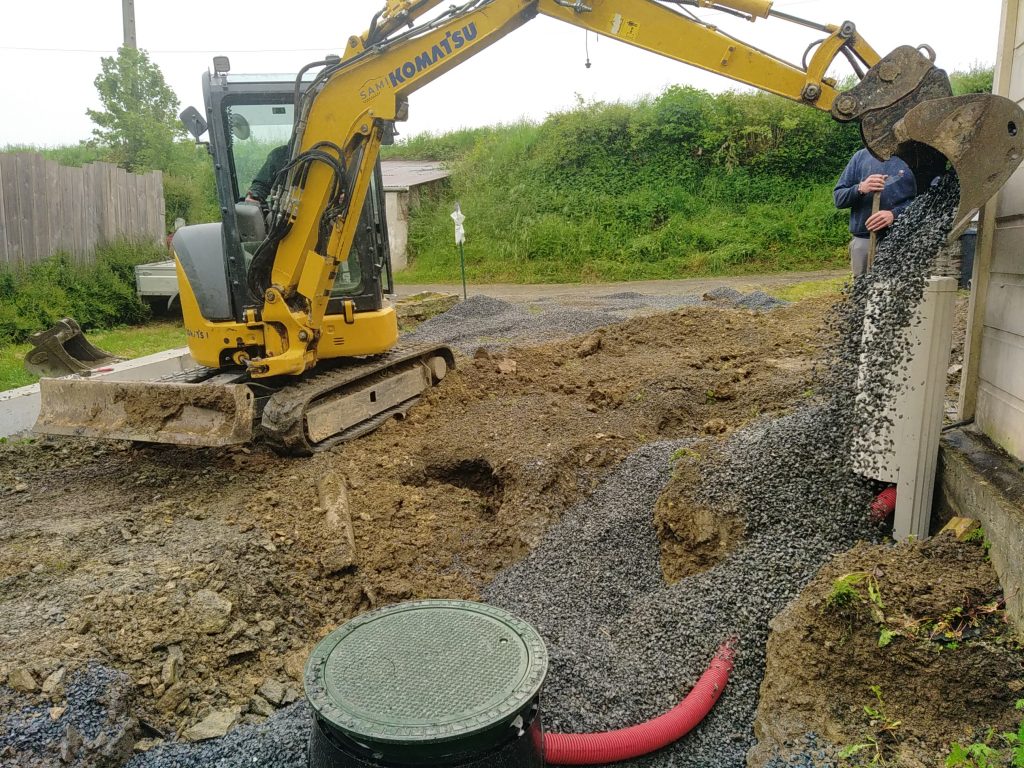 Nous intervenons dernièrement à Saint-Georges-Montcocq (50000), aux côtés de la SARL Fossey Le Blond TP, pour la réhabilitation d'un Assainissement Non Collectif totalement Hors Service et qui déborde dans la cour.